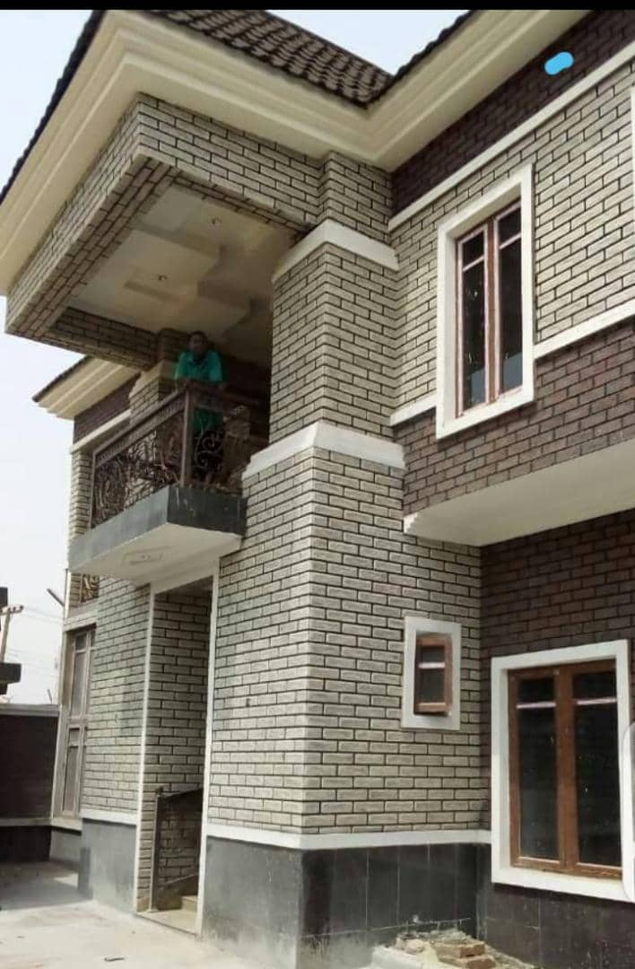 Eco bricks beige color with some minutes color mix of orange, black and brown were used here on the front pillars of this duplex. Eco bricks is a new type of brick tile in the Nigerian tile market with some smooth faced character that comes with it. The brick brick will give your pillars some calm appearance due to its texture.